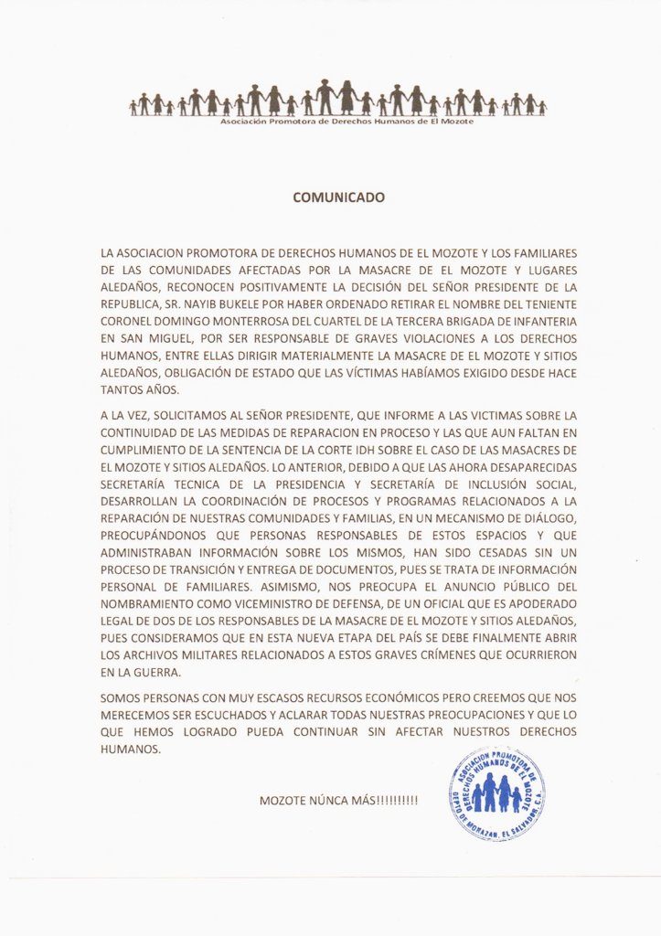 Comunicado de la Asociación Promotora de Derechos Humanos de El Mozote