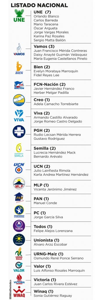 Con un promedio del 90 por ciento de los votos procesados correspondientes a los listados de candidatos a diputados al Congreso de la República, el partido de la UNE se convertirá en la primera fuerza del Organismo Legislativo. Sin embargo, las curules ganadas no son suficientes para dominar el Congreso, por lo que necesitará de aliados para poder concretar su agenda.
