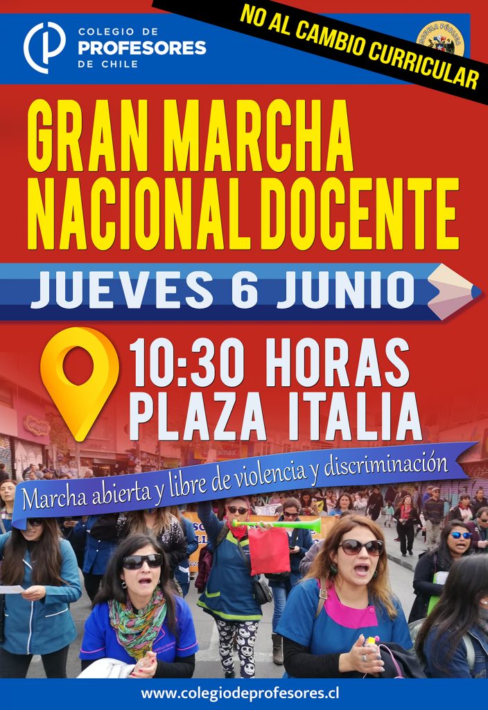 Siguiendo el plan de acción del Paro Nacional Indefinido, el Magisterio convocó a una multitudinaria manifestación este jueves 6 de junio a las 11 horas en la Plaza Italia de Santiago. Profesores marcharán por la Alameda hasta calle Echaurren, en un recorrido autorizado por la Intendencia Metropolitana demandando que el Gobierno atienda la crisis de la Educación Pública, se retracte del cambio curricular que hace optativas las materias de Historia, Artes y Educación Física y mejore las condicione laborales de los maestros de Chile.