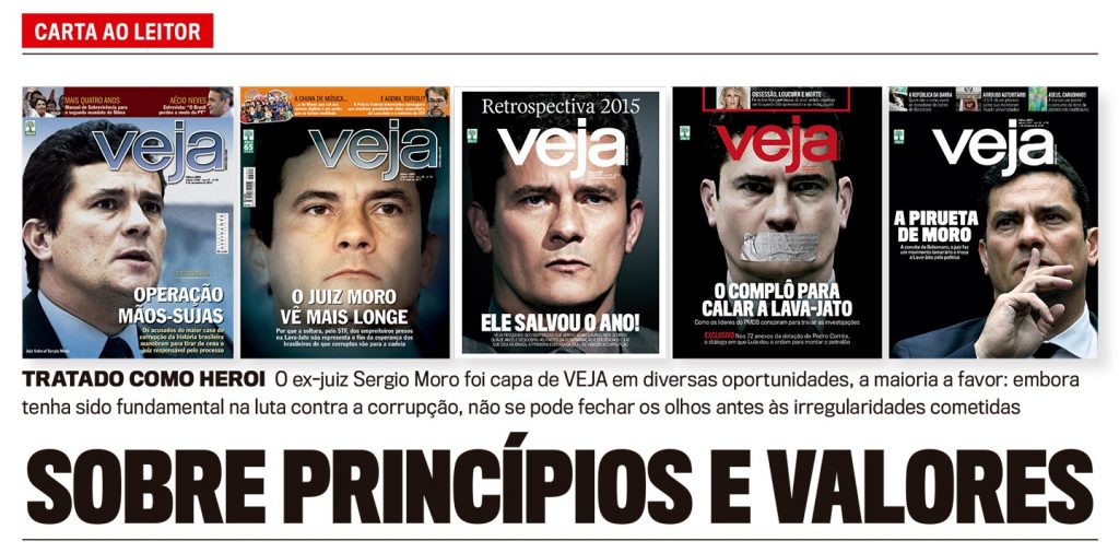 Além da reportagem, a “Carta ao Leitor” explica não só o processo jornalístico empregado pela Veja para autenticar o material, mas também as razões pelas quais a revista – que, como admite no editorial, tratou Moro como um herói nacional várias vezes em suas capas – agora reconhece que a conduta do juiz era bastante problemática e que a condução dos processos da Lava Jato não se deu de acordo com a lei.