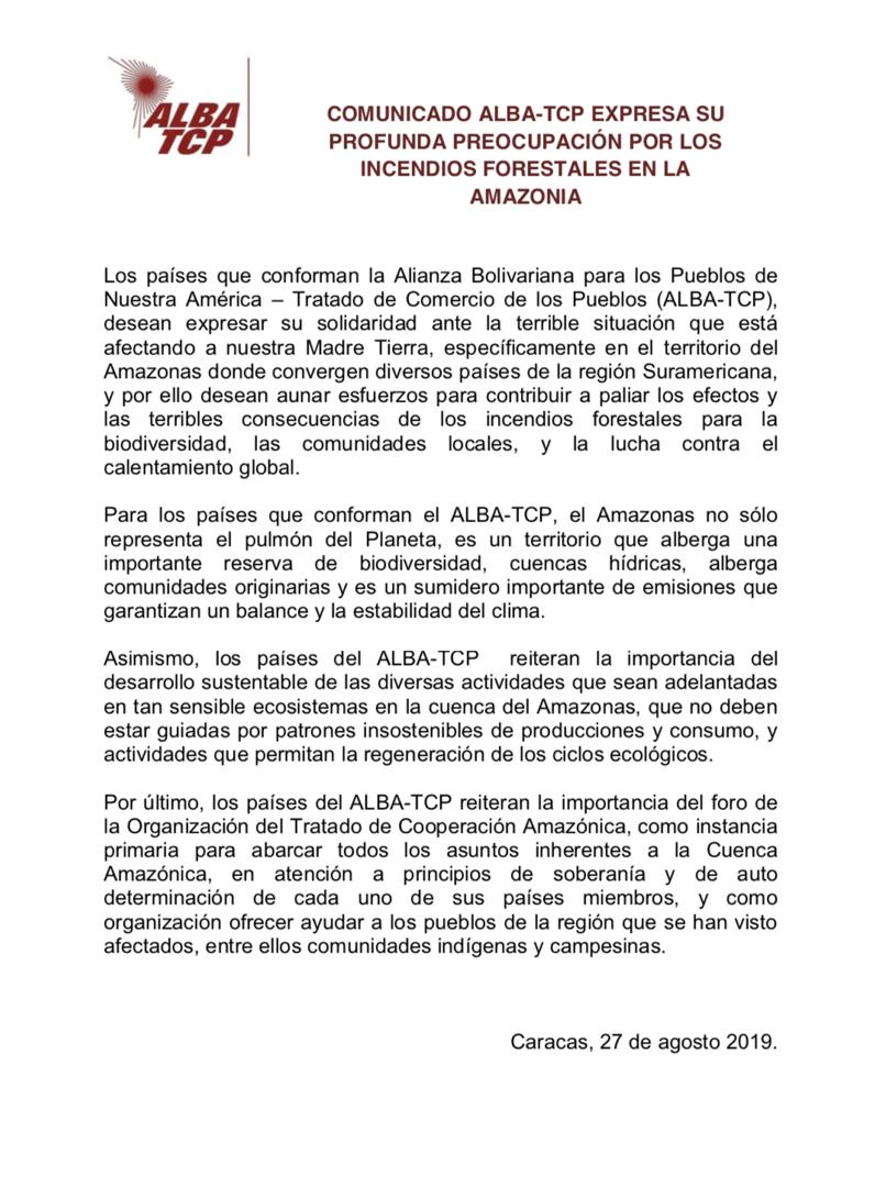 ALBA-TCP expresa su profunda preocupación por los incendios forestales en la Amazonía ALBA En 28/08/2019 4.275 Compartir ALBA-TCP expresa su profunda preocupación por los incendios forestales en la Amazonía VOLVER ALBAAmazoniaflashsegunda 4.275 Compartir