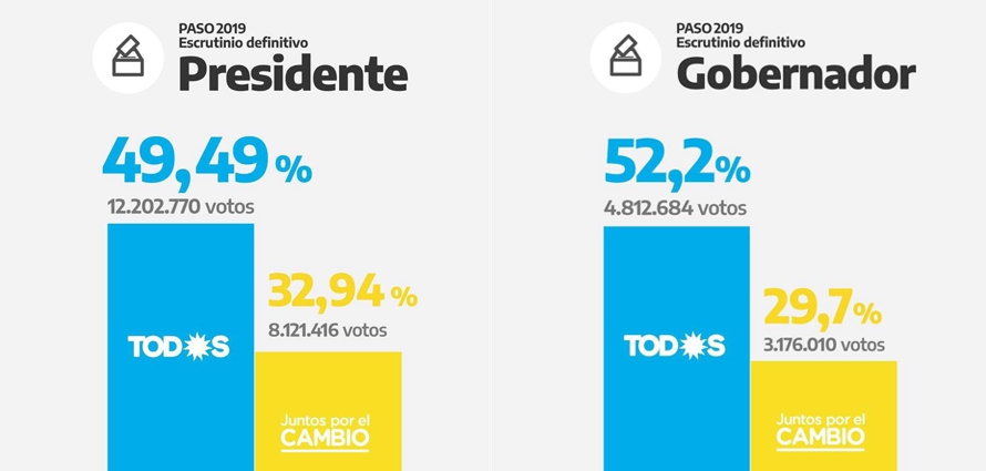 Con el recuento de la provincia de Buenos Aires concluyó el escrutinio definitivo de los votos emitidos en las Primarias Abiertas Simultáneas y Obligatorias (PASO) del 11 de agosto que definieron a los candidatos a presidente que competirán el 27 de octubre. El resultado final del total del país arrojó que la fórmula del Frente de Todos, Alberto Fernández – Cristina Kirchner obtuvo 4.092.625 de votos más que la de Juntos por el Cambio, Mauricio Macri – Miguel Ángel Pichetto.