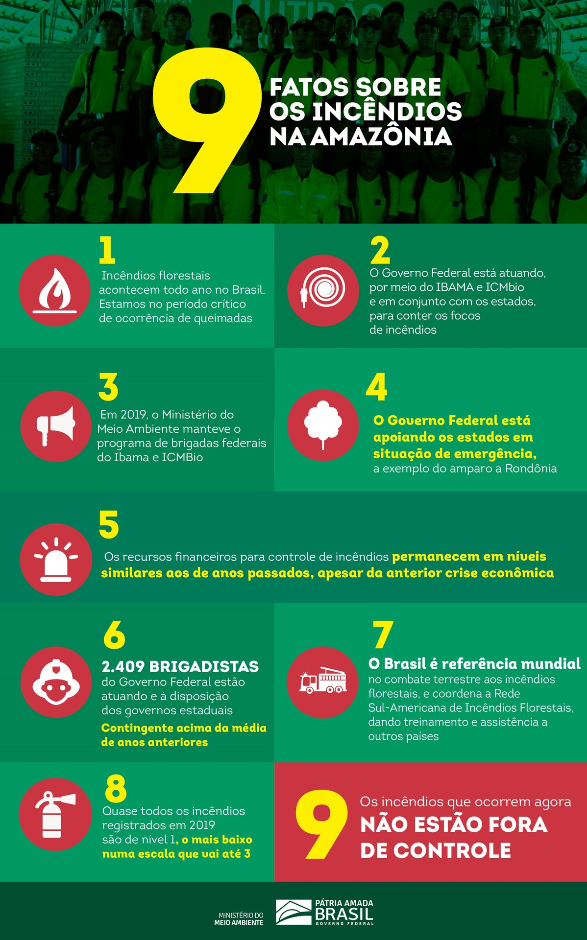 En este punto, el gobierno destaca que es ejemplo en la preservación del ambiente. Sostiene: «Brasil es una referencia mundial en la lucha contra incendios en tierra y coordina la red incendios forestales americanos, proporcionando capacitación y asistencia a otros países».