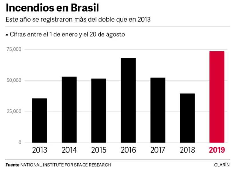 Entre enero y el 21 de agosto, el organismo brasileño de observaciones espaciales INPE registró en Brasil 75.336 focos de incendio, un 84% más que en el mismo periodo de 2018. Ese número muestra un aumento de 2.493 focos respecto al lunes.