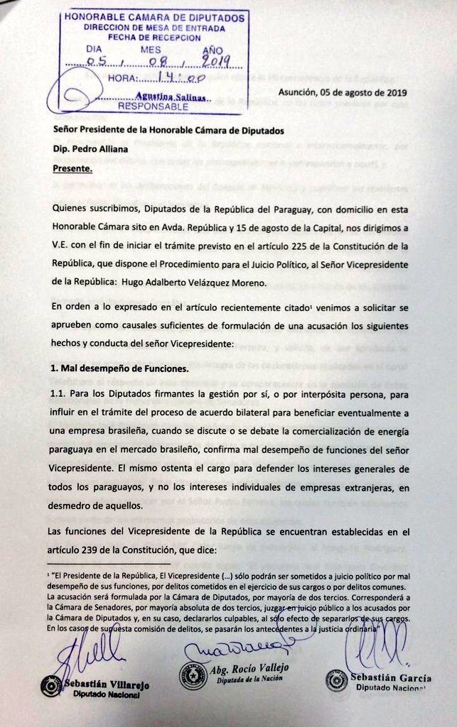 Instan a los legisladores que aprueben dicha solicitud teniendo en cuenta que las causales son haber influido en el trámite del proceso de acuerdo bilateral para beneficiar eventualmente a una empresa brasileña, “cuando se discute o se debate la comercialización de energía paraguaya en el mercado del Brasil», lo que confirma un mal desempeño en las funciones del segundo del Ejecutivo.