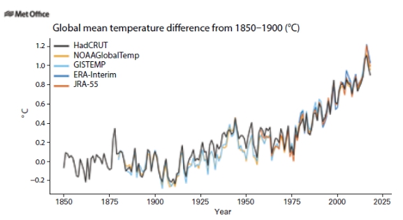 - 1°C: aumento de la temperatura global promedio desde los niveles preindustriales (1850-1900) hasta 2018.