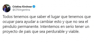 En un mensaje escueto, la expresidenta apuntó que «todos tenemos que saber el lugar que tenemos que ocupar para ayudar a cambiar esto y que no sea el péndulo permanente».