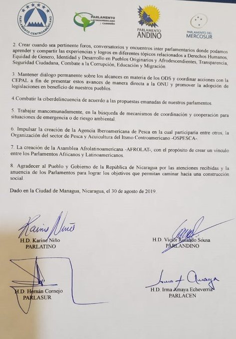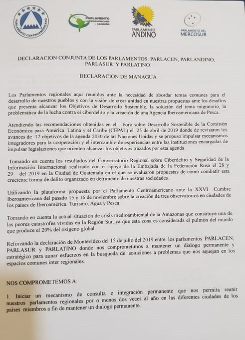 El pasado 30 de agosto, se reunieron en la ciudad de Managua, Nicaragua, los directivos del Parlamento Centroamericano (PARLACEN), Parlamento Latinoamericano y Caribeño (PARLATINO), Parlamento Andino (PARLANDINO) y el Parlamento del MERCOSUR (PARLASUR), en marco de los Foros regionales institucionales, «Conversatorio de Parlamentos Regionales de América Latina».