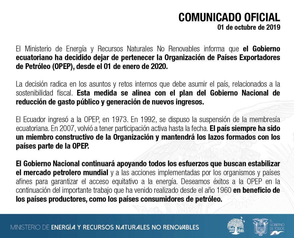 El Gobierno de Lenín Moreno anunció este martes que Ecuador abandonará la Organización de Países Exportadores de Petróleo (OPEP) el 1 de enero de 2020, así lo informó el Ministerio de Energía y Recursos Naturales No Renovables.