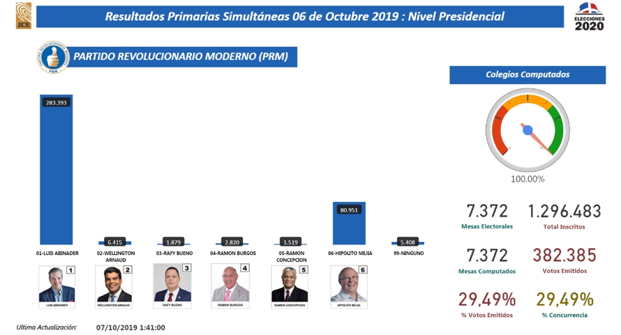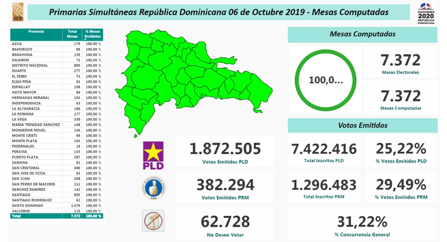 La Junta Central Electoral, luego de computarse las 7.372 mesas habilitadas, se comunicaron los siguientes resultados provisionales: