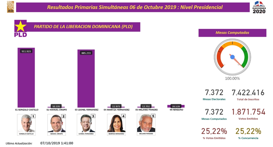 Los resultados provisionales a nivel presidencial dentro del PLD como ganador a Gonzalo Castillo, con 911,923 votos (48.72%) y a Leonel Fernández con 885,233 votos (47.29 %).