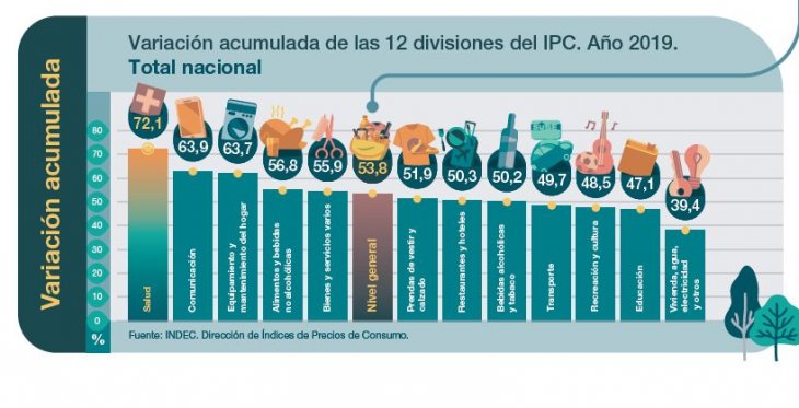 En 2019 el rubro más inflacionario fue el de los servicios de salud, con precios que ascendieron el 72,1%, largamente por encima del promedio anual. En segundo lugar, también muy lejos del promedio, quedaron los gastos en comunicación con aumentos del 63,9%, seguidos por el rubro Equipamiento y mantenimiento del hogar con el 63,7.