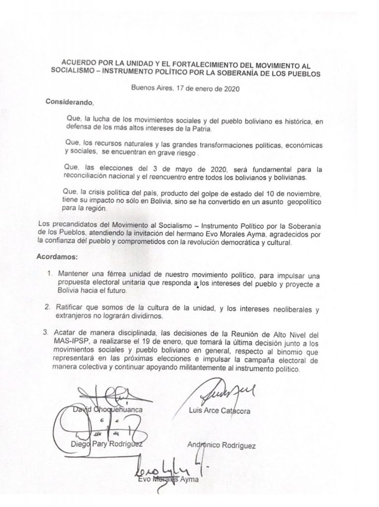 Acuerdo por la unidad y el fortalecimiento del MAS-IPSP anuncia que el binomio será definido el 19 de enero