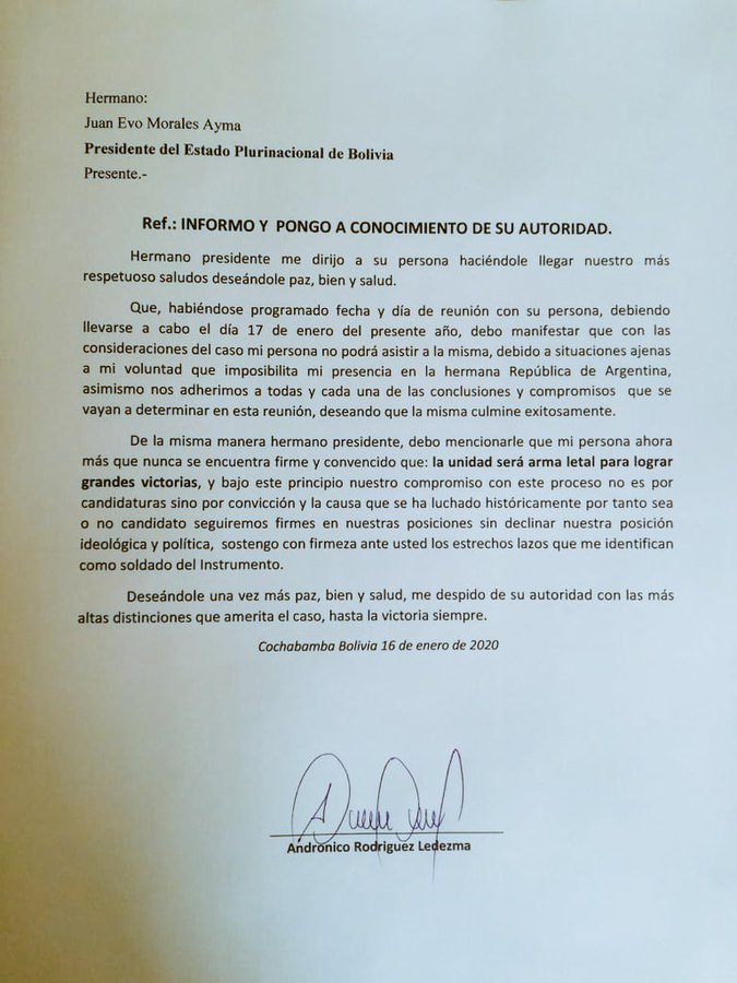 Por ello es importante tomar en cuenta la sabiduría de nuestros pueblos, serán ellos quienes orientarán para que se tome una decisión correcta, para trabajar en una Bolivia más unida, más democrática, más participativa, que no excluya a nadie, donde todas y todos construyamos la hermandad y recuperar el verdadero espíritu de nuestro proceso de cambio. Como ya se sabe, nuestros dirigentes del instrumento político y de los movimientos sociales han anunciado las fechas donde se hará conocer el binomio para participar en las próximas elecciones generales.