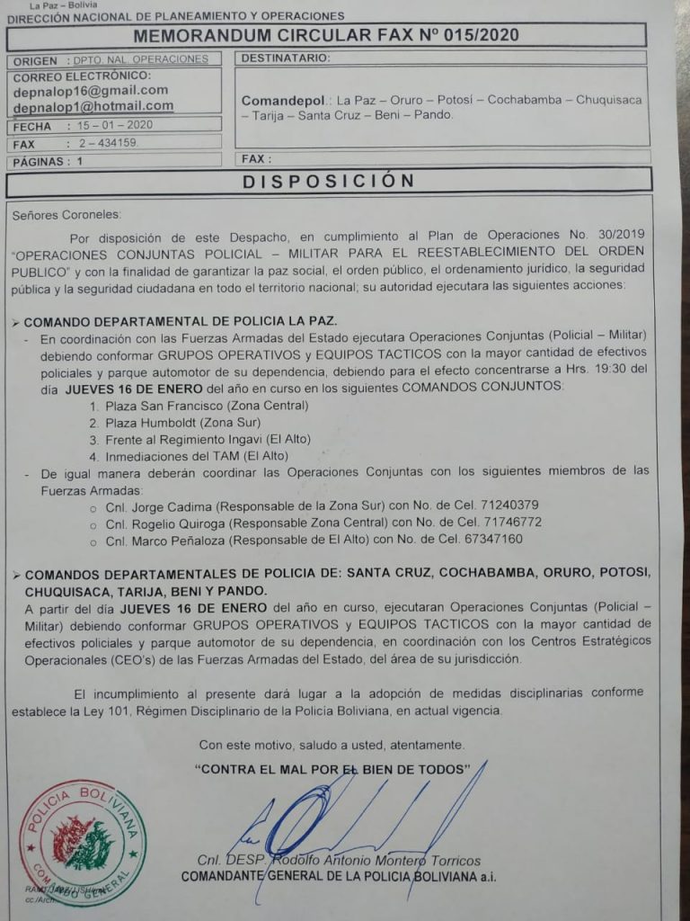 En el documento, el comandante general de la Policía, Rodolfo Montero, instruye a los nueve comandos departamentales a conformar “grupos operativos y equipos tácticos” para realizar “operaciones conjuntas Policial – Militar para el restablecimiento del orden público”, señala el documento.