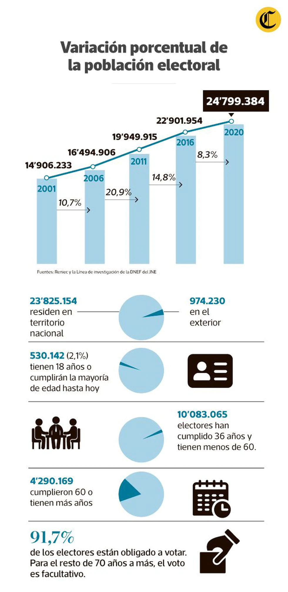 En los últimos 19 años, el padrón electoral peruano ha aumentado en casi nueve millones de ciudadanos habilitados para sufragar, de acuerdo con datos del Registro Nacional de Identificación y Estado Civil (Reniec). Desde las elecciones generales del 2016 hasta este proceso extraordinario, el número de electores aumentó en 8,3%.