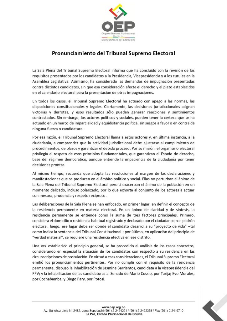 El Tribunal Supremo Electoral (TSE) decidió ayer inhabilitar las candidaturas por el MAS al Senado de Evo Morales (Cochabamba) y Diego Pary (Potosí), así como la del postulante a la Cámara Alta de Creemos por Tarija, Mario Cossío, y de la candidata a la vicepresidencia por FPV, Jessmy Barrientos, para las elecciones generales del 3 de mayo.