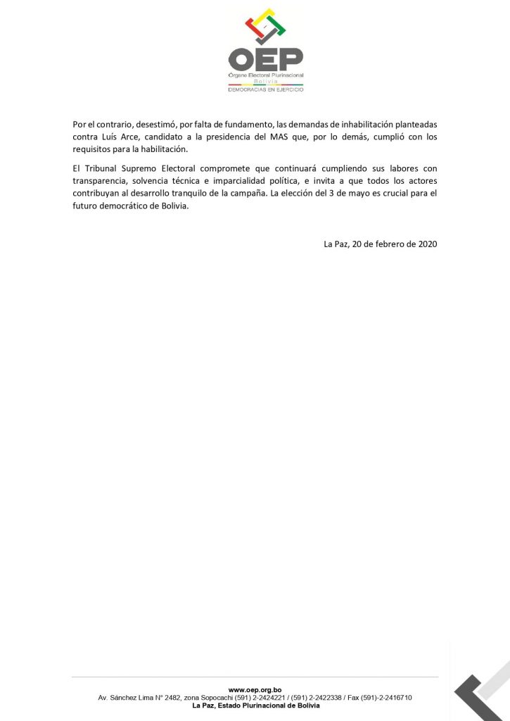 “La decisión del TSE es un golpe contra la democracia. Los miembros del TSE saben que cumplo todos los requisitos para ser candidato. El objetivo final es la proscripción del MAS”, dijo.