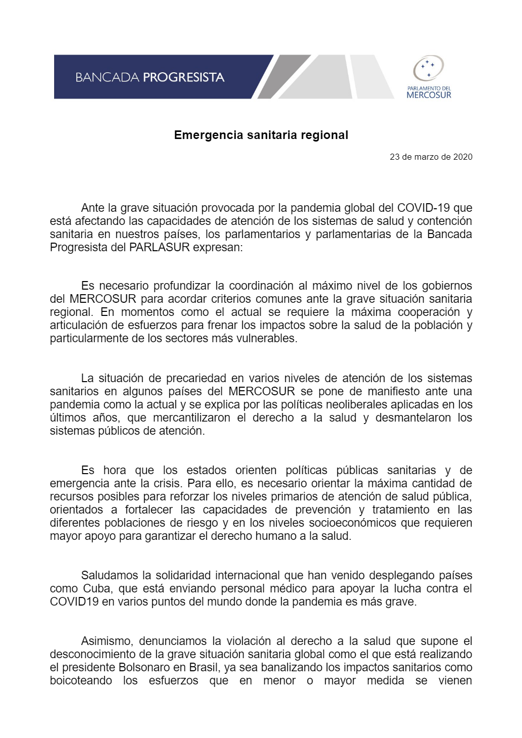 Ante la grave situación provocada por la pandemia global del COVID-19 que “está afectando las capacidades de atención de los sistemas de salud y contención sanitaria en nuestros países, los parlamentarios expresan que “es necesario profundizar la coordinación al máximo nivel de los gobiernos del MERCOSUR para acordar criterios comunes ante la grave situación sanitaria regional. En momentos como el actual se requiere la máxima cooperación y articulación de esfuerzos para frenar los impactos sobre la salud de la población y particularmente de los sectores más vulnerables”.