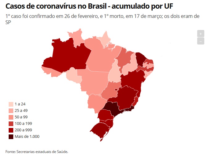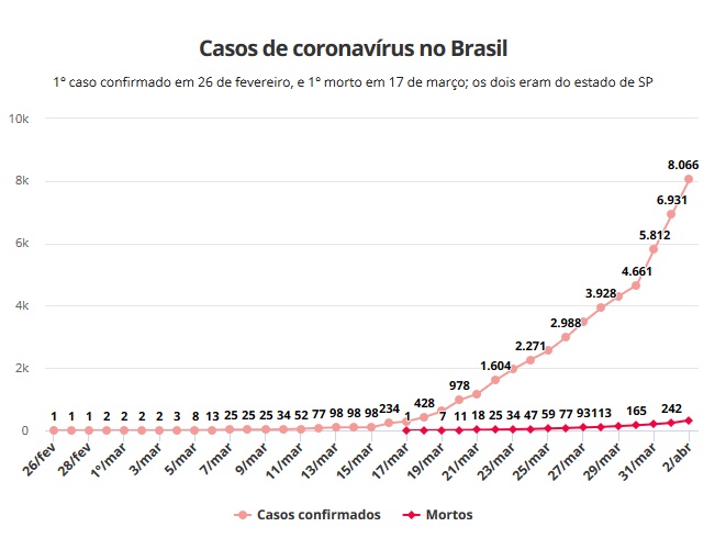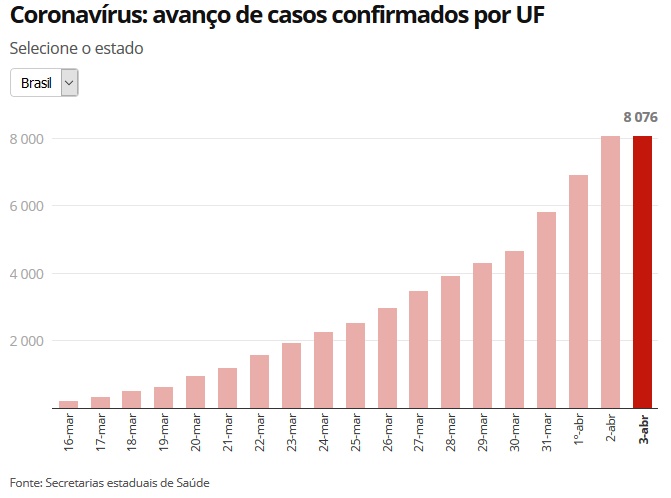 O último balanço do Ministério da Saúde, divulgado na tarde de quinta-feira (2), apontava 299 mortes e 7.910 casos confirmados de coronavírus no Brasil.