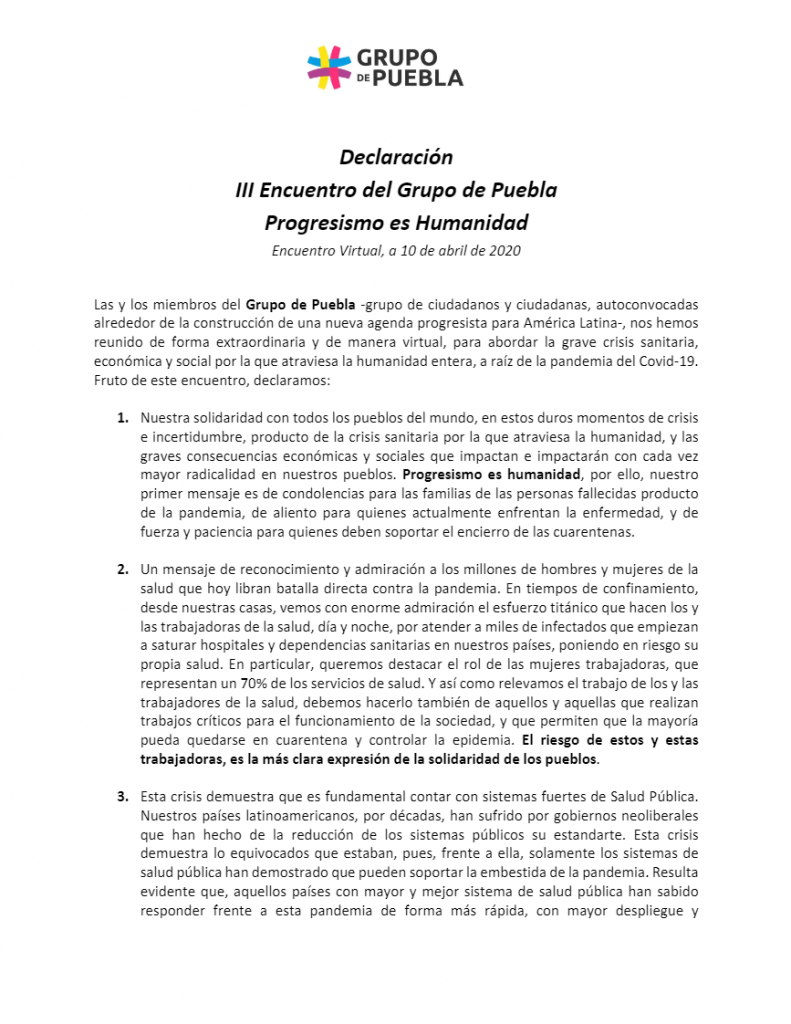 GRUPO DE PUEBLA INSTA A LOS GOBIERNOS A IMPLEMENTAR CON URGENCIA POLÍTICAS SOCIALES QUE APUNTEN A LA SALUD PÚBLICA, ALIMENTACIÓN Y MEDIDAS PALIATIVAS ANTE EL DESEMPLEO