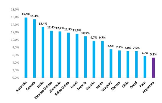 Por otro lado, si tomamos la comparación internacional que realiza la OCDE (Organización para la Cooperación y el Desarrollo Económico) a 2017, Argentina es uno de los países que menor gravamen realiza a los que mayores ingresos tienen. La OCDE estima cuánto pesan los impuestos a los ingresos sobre las personas y a las ganancias sobre las empresas, sobre el PBI. Son impuestos progresivos y sobre flujos pagan más los que más ingresos tienen (están excluidos, no obstante, los impuesto patrimoniales).En Argentina a 2017 estos impuestos pesan 5,3%, mientras que en países como Brasil o Chile pesan 7%. En Francia 10,9%, Israel 11,6%, Alemania 12,2%, Estados Unidos 12,4%, Italia 13,4%, Canadá 15,4%, Australia 15,9%.