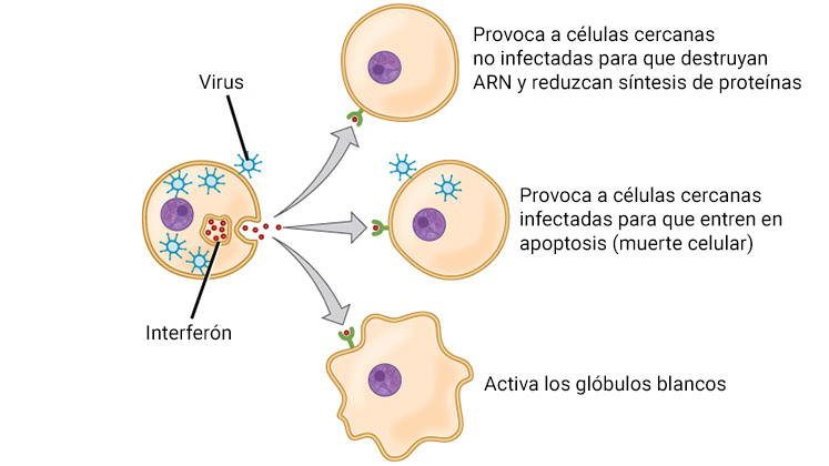 Interferones soltados por un una célula infectada provocan una reacción defensiva en células cercanas (CNX OpenStax, CC BY 4.0, traducido al español)