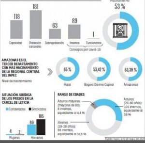 En la cárcel de Leticia, cuyo primer caso registrado fue el de un funcionario del Inpec, ya se han contagiado el 49 % de los presos, puesto que en este centro penitenciario hay 181 internos en total. Además, la Gobernación de Amazonas confirmó que falleció por covid-19 un privado de la libertad que estaba en prisión domiciliaria.
