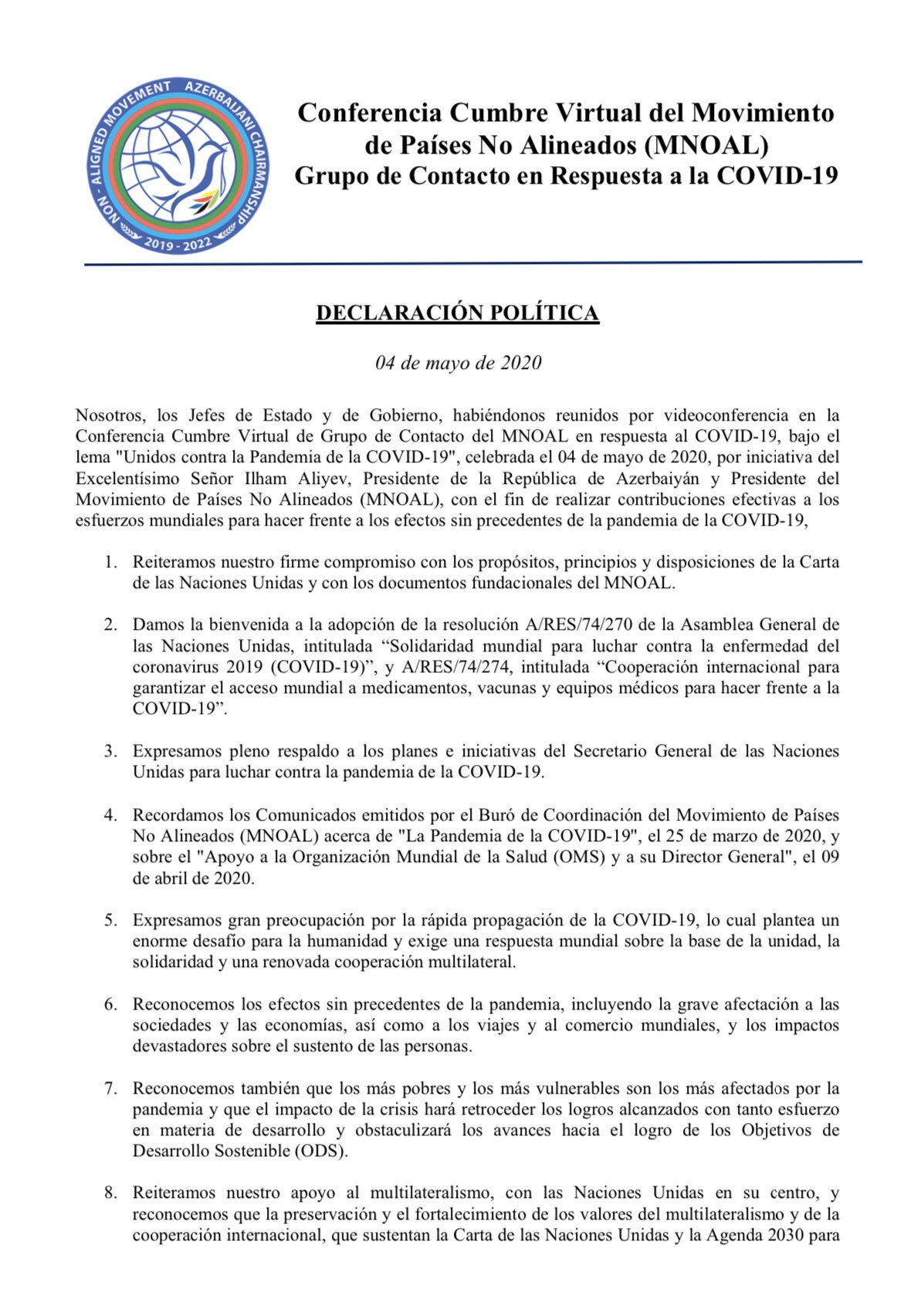 Declaración adoptada por la Cumbre “Unidos contra el COVID-19” del Movimiento de Países No Alineados (MNOAL)