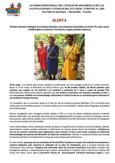 Advierten que estamos «a puerta de un etnocidio» y solicitan ayuda y asistencia humanitaria internacional para precautelar la integridad de los pueblos indígenas de la Amazonía sino se adoptan medidas urgentes.