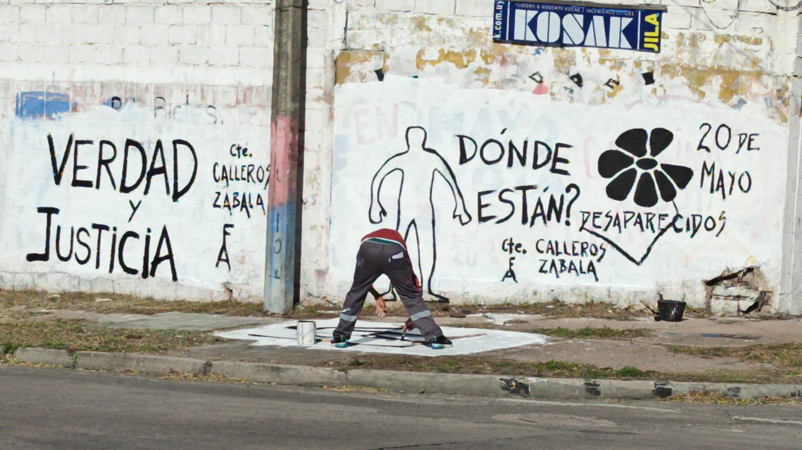 Integrantes del Comité de Base Calleros Zabala, del Frente Amplio, pintaron un grafitti con motivo del 20 de mayo, día en que se debería realizar la Marcha del Silencio pero que, por motivo de la pandemia, se hará de forma virtual no presencial.