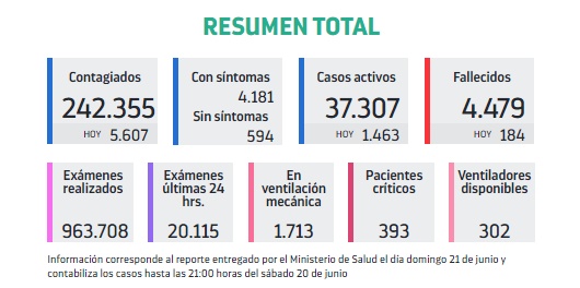 Por otra parte, el Minsal lamentó el fallecimiento de 184 personas y un total acumulado de 4.479. Esta cifra de acuerdo a la metodología en base a la inscripción de los decesos en el Registro Civil en las últimas 24 horas.