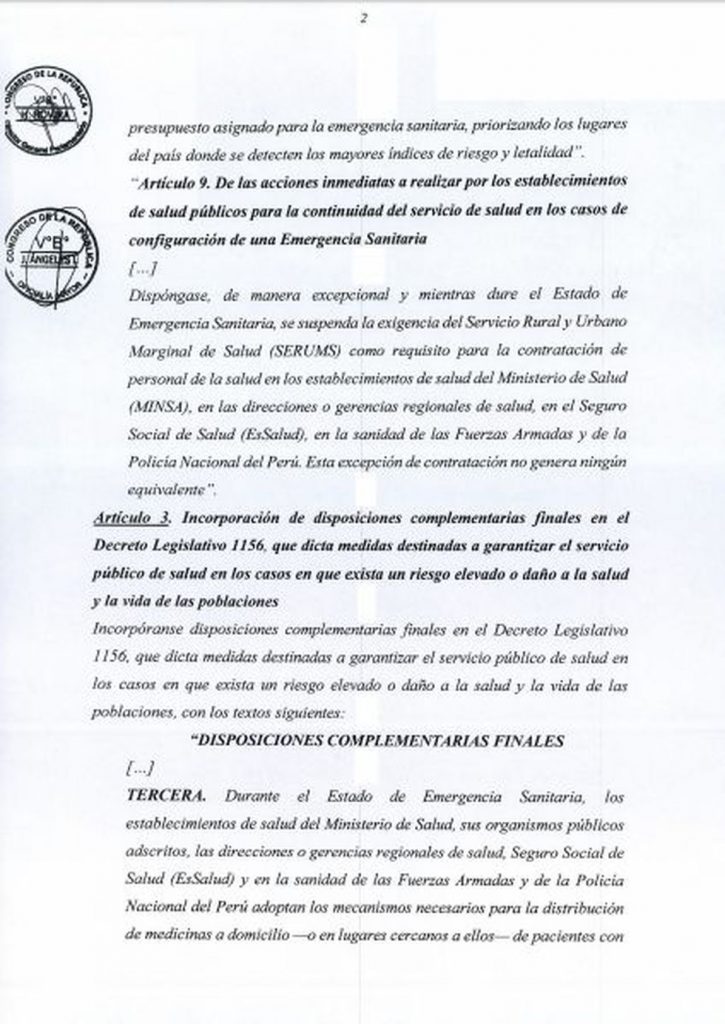 La segunda modificación consiste en la suspensión excepcional del Servicio Rural Urbano Marginal de Salud (Serums) como requisito para la contratación de personal de salud mientras dure el Estado de Emergencia Sanitaria.