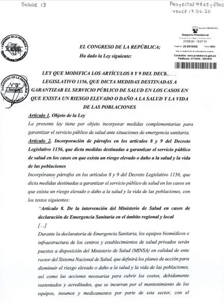 “Durante la declaratoria de Emergencia Sanitaria, los equipos biomédicos e infraestructura de los centros y establecimientos de salud privados serán puestos a disposición del Ministerio de Salud (Minsa) en calidad de ente rector del Sistema Nacional de Salud, que definirá los planes de acción para disminuir el riesgo elevado o daño a la salud y la vida de las poblaciones, así como las acciones necesarias para cubrir los costos, debidamente sustenTados y acreditados, que se incurran por el mantenimiento de los equipos, insumos y medicamentes por parte de este sector, con el presupuesto asignado para la emergencia sanitaria, priorizando los lugares del país donde se detecten los mayores índices de riesgo y letalidad”. Asimismo, se establece que la Superintendencia Nacional de Salud (Susalud) “supervisa y sanciona” a los centros de salud privados que incumplan la presente norma.