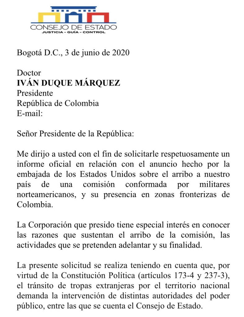 El Consejo de Estado decidió enviarle una carta al presidente de la República, Iván Duque, para solicitarle un informe oficial en relación con el anuncio hecho por la embajada de los Estados Unidos sobre el arribo al país de fuerzas militares norteamericanas.
