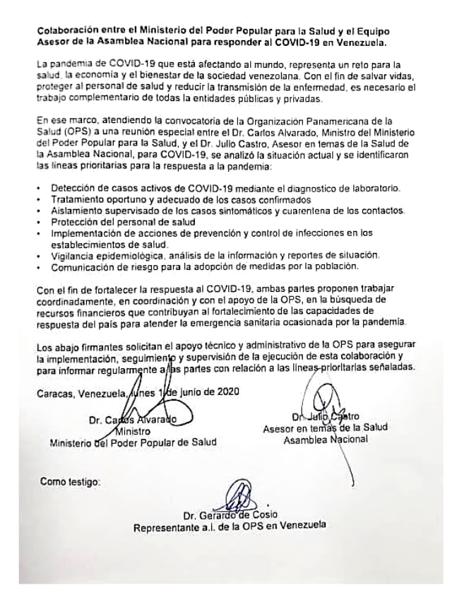 Rodríguez detalló que este acuerdo fue firmado por el ministro para la Salud, Carlos Alvarado; y el infectólogo y asesor de la Asamblea Nacional (AN), Julio Castro y como testigo del hecho, el Dr. Gerardo de Cossio representante de la Organización Panamericana de la Salud/Organización Mundial de la Salud en Venezuela.