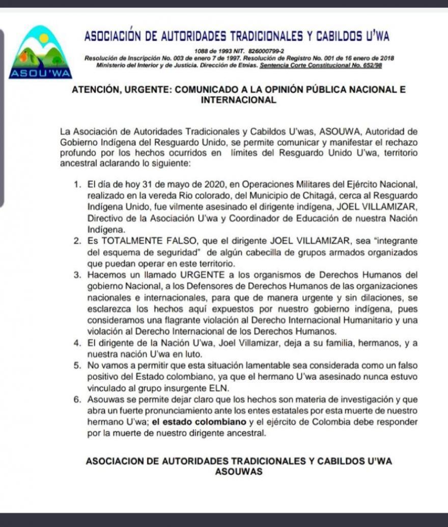 «No vamos a permitir que esta situación lamentable sea considerada como un falso positivo del Estado colombiano, ya que el hermano U’wa asesinado nunca estuvo vinculado al grupo insurgente ELN».