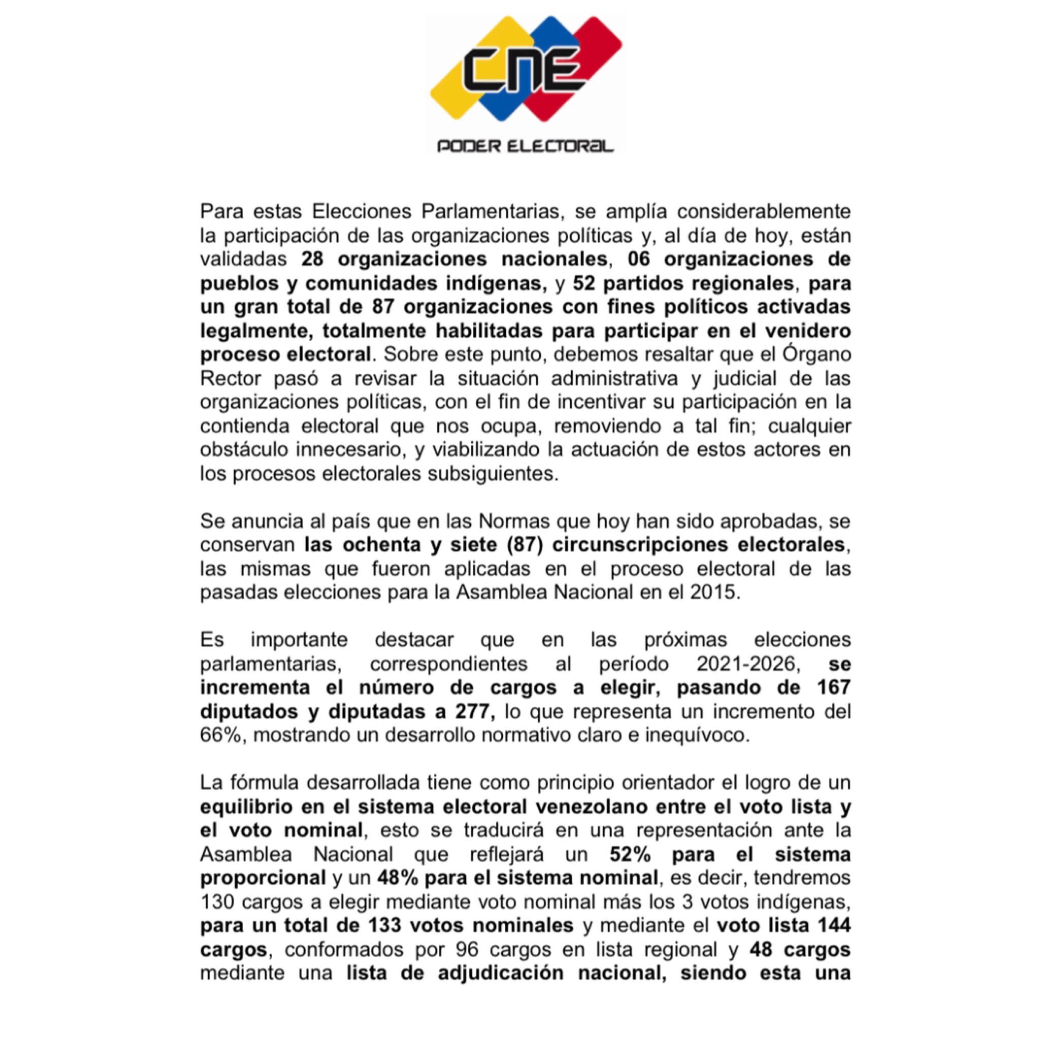 Este martes, la rectora del Consejo Nacional Electoral (CNE), Indira Alfonzo Izaguirre, anunció las normativas especiales para las elecciones parlamentarias que se realizarán este año, para elegir a las y los diputados de la Asamblea Nacional para el período 2021-2026. Indicó que el número de organizaciones políticas que participarán en las parlamentarias es 87 en total, mientras que el número de cargos se elevan de 167 a 277.