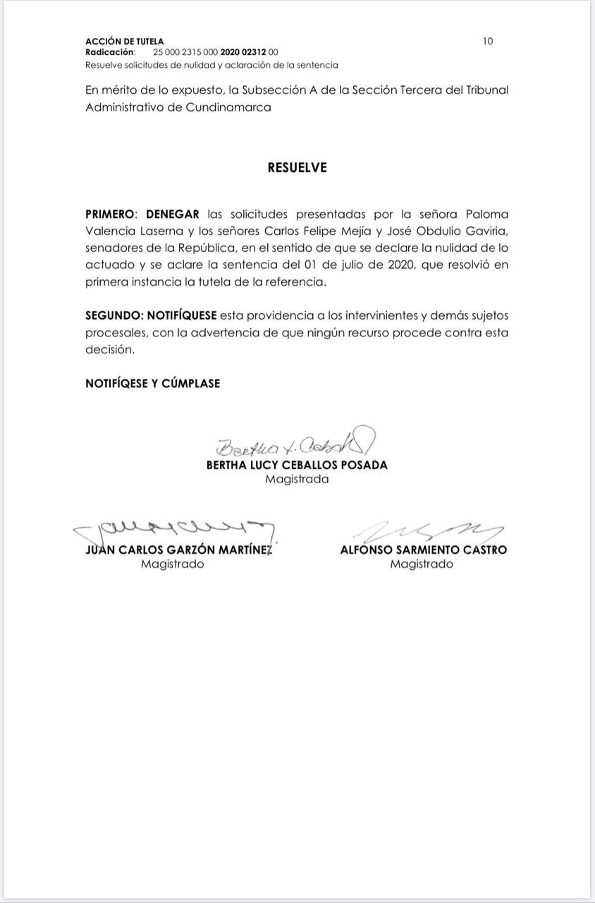 Tribunal de Cundinamarca niega acción de nulidad de senadores Paloma Valencia, José Obdulio Gaviria y Carlos Felipe Mejía