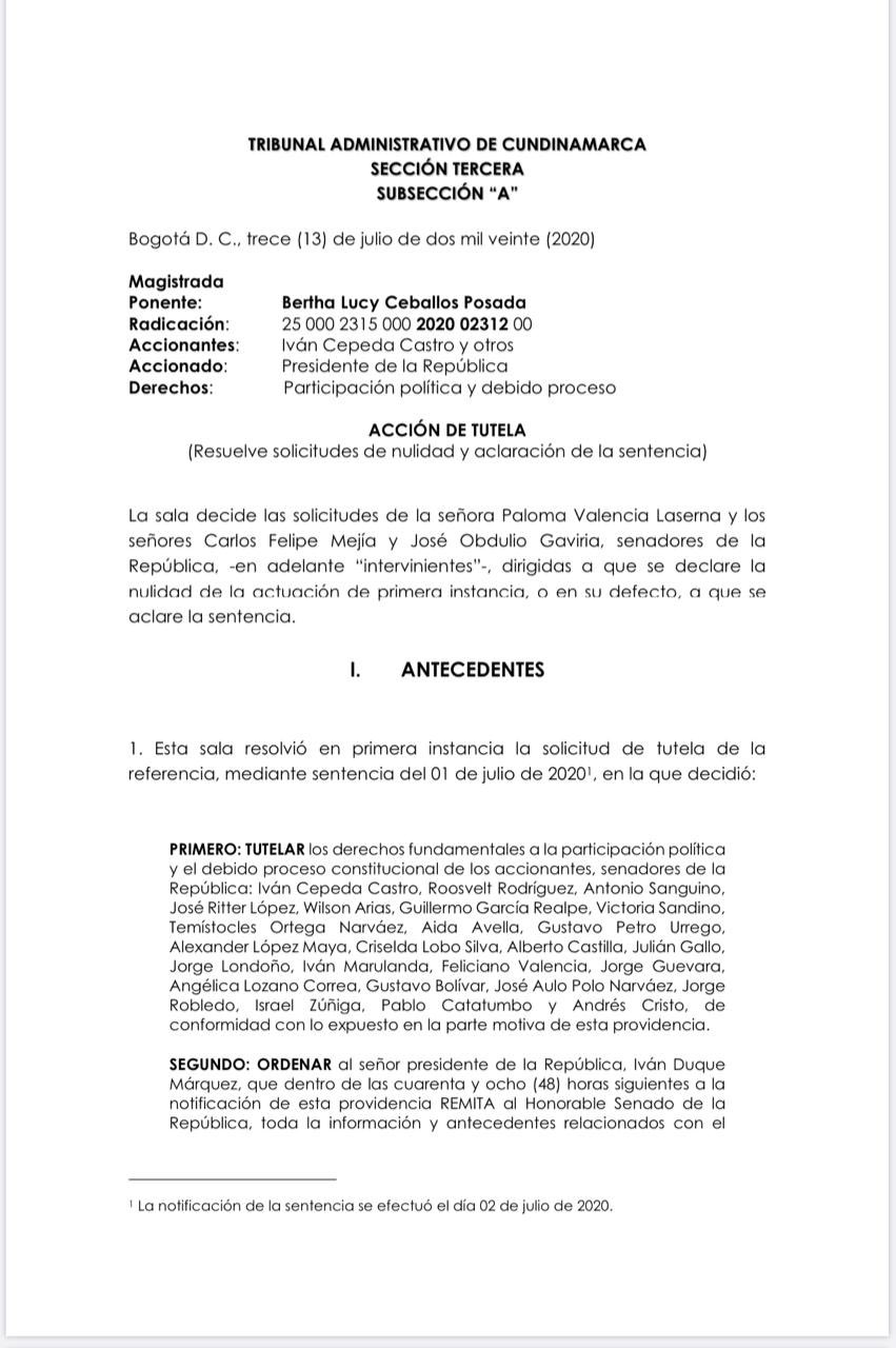 El argumento principal de Cepeda era que sus derechos a la participación política habían sido vulnerados. Mientras estudiaba la tutela, el Tribunal ordenó colgar una invitación en la página web del Senado para que la corporación allegara sus opiniones. Pero los senadores Carlos Felipe Mejía, Paloma Valencia y José Obdulio Gaviria se valieron de esa razón para pedir la nulidad: “en el Senado reposa toda la información de los suscritos (email, wasap, celular, dirección, etc.) y por esa vía se han hecho conocer desde tiempo atrás citaciones, invitaciones, acciones de tutela; de manera que cualquier otro medio distinto a la página web hubiera resultado eficaz e idóneo para notificar la existencia de una acción de tutela”.
