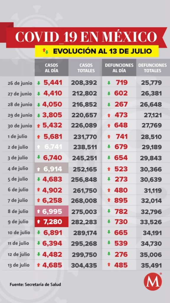 Este 13 de julio se reportaron 485 nuevas muertes y 4 mil 685 nuevos casos de covid-19. Hay 2 mil 363 defunciones sospechosas.