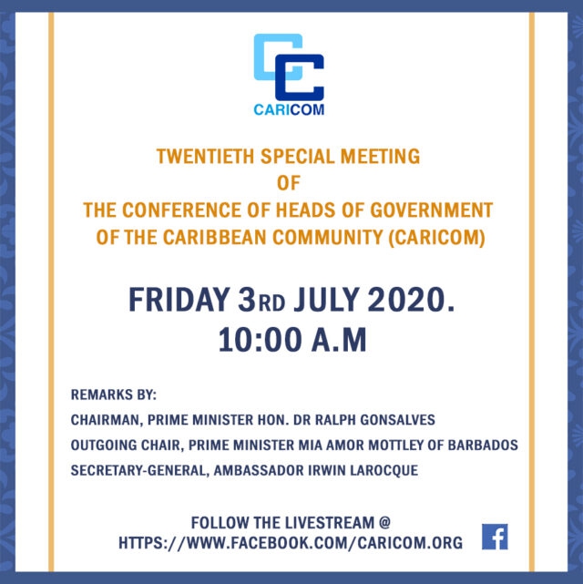 This Twentieth Special Meeting of CARICOM Heads will be held via video conference beginning at 10:00 a.m. Eastern Caribbean time.