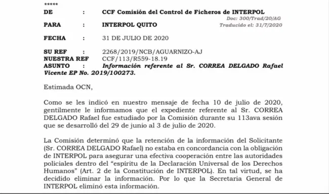 Mediante oficio enviado por la Comisión de Control de Ficheros de INTERPOL a la oficina de la entidad en Quito, bajo el asunto “Información referente al Sr. Correa Delgado Rafael Vicente EP N°. 2019/100273”, se informa que en la 113ava sesión se estudió el caso de Rafael Correa Delgado y se determinó que es improcedente hacer efectiva una cooperación dentro del espíritu universal de los Derechos Humanos.
