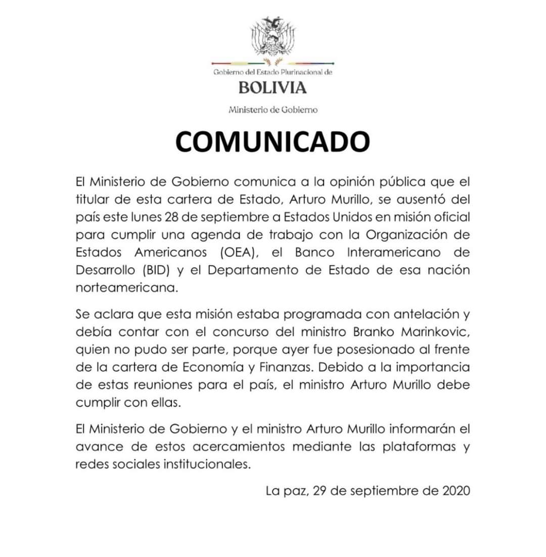 El ministro de Gobierno, Arturo Murillo, viajó ayer a Estados Unidos, en el marco de una misión oficial para cumplir con una agenda de trabajo, informó hoy, mediante un comunicado, esa cartera de Estado.