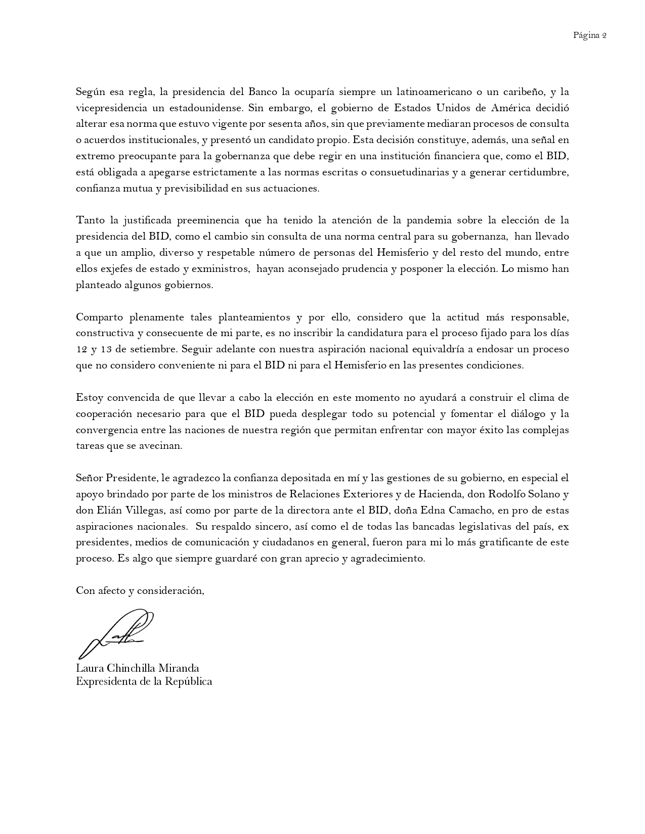 “Considero que la actitud más responsable, constructiva y consecuente de mi parte, es no inscribir la candidatura para el proceso fijado para los días 12 y 13 de septiembre. Seguir adelante con nuestra aspiración nacional equivaldría a endosar un proceso que no considero conveniente ni para el BID ni para el Hemisferio en las presentes condiciones”, dijo Chinchilla en un comunicado.