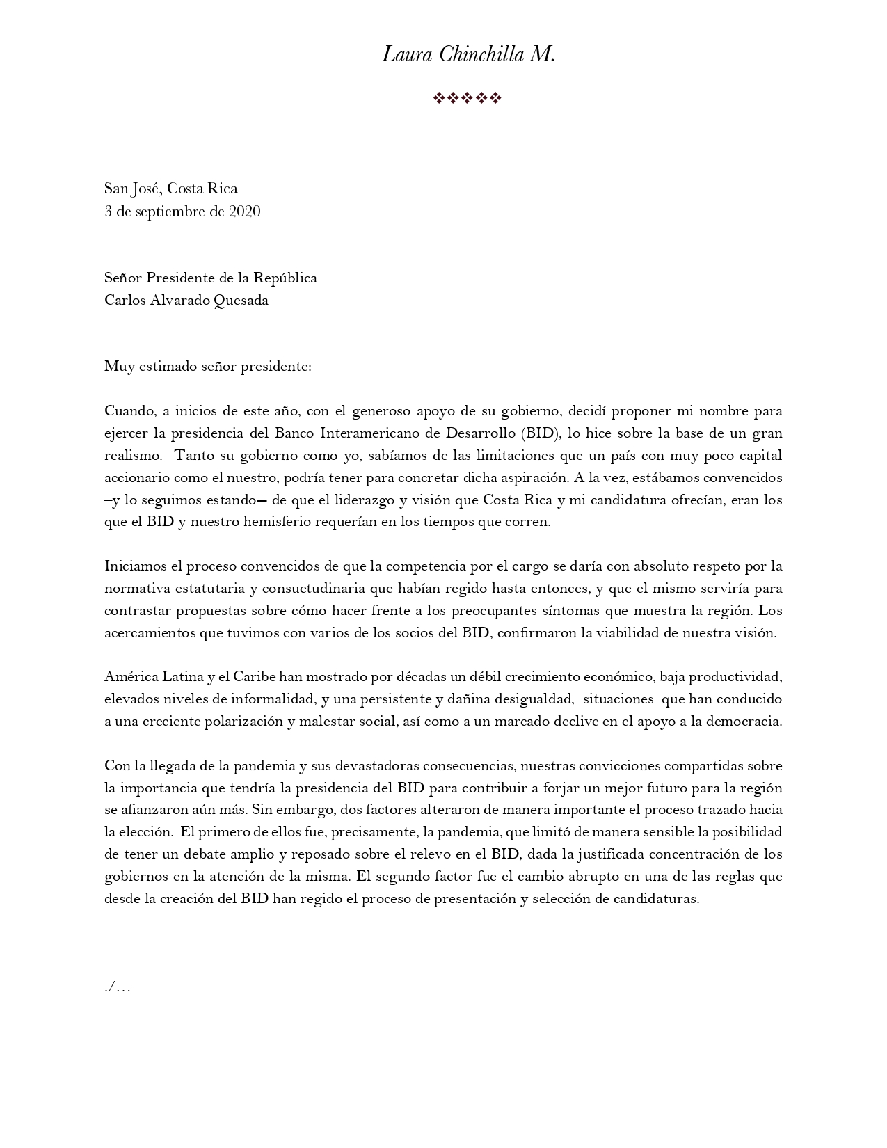 Carta de Laura Chinchilla al presidente de Costa Rica Carlos Alvarado Quesada