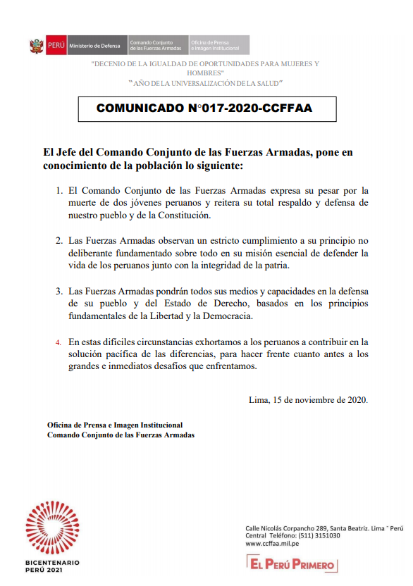 En su mensaje, el Jefe del Comando Conjunto de las Fuerzas Armadas lamentó el fallecimiento de los dos jóvenes durante la segunda gran marcha contra el gobierno de Manuel Merino y “reiteró su respaldo y defensa del pueblo y la Constitución”.