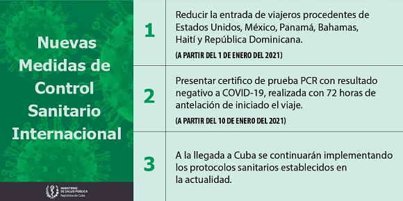De ahí que teniendo en cuenta estos elementos, la actual situación epidemiológica nacional, regional e internacional y la necesidad de tomar un grupo de medidas que posibiliten la disminución de casos de COVID-19 en el país, se ha decidido reducir la entrada de viajeros procedentes de Estados Unidos, México, Panamá, Bahamas, Haití y República Dominicana, a partir del 1 de enero del 2021, para lo cual las autoridades de la Aeronáutica Civil de Cuba reajustan con las aerolíneas los detalles necesarios. Tan pronto la situación epidemiológica lo permita, se restablecerá gradualmente la frecuencia de vuelos.