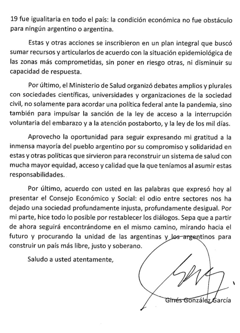 Carta de renuncia del exministro de Salud Ginés González García