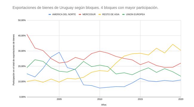 Además, el Mercosur es fundamental para el desarrollo del empleo y la producción nacional. Uruguay tiene una fuerte vocación exportadora y una parte de nuestra producción agroexportadora tiene un peso determinante en la búsqueda de mercados extrarregionales para poder comercializar nuestros principales productos de exportación como son la carne, la soja y la celulosa que representan casi el 50% de nuestras exportaciones de bienes. En los últimos años, con el fenómeno de China como principal socio comercial de América Latina, el gigante asiático juega un papel importante en el destino de nuestras exportaciones, casi el 30% de las mismas tienen ese destino. Sin embargo, estos sectores no terminan moviendo la aguja del empleo y la actividad económica nacional.